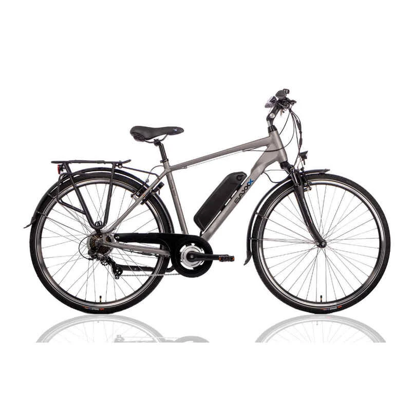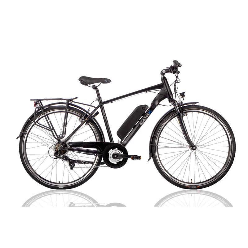 Einfaches, aber angenehm zu fahrendes elektrisches Herrenfahrrad mit 7-Gang Shimano Tourney Kettenschaltung und 10,4 Ah Akku am Rahmen. Der Hinterradmotor überträgt seine Kraft auf natürliche Weise, sodass du auch unter schwierigeren Bedingungen immer die Kontrolle behältst. Auch für Ausflüge in die Natur ist dieses Cityrad bestens geeignet, mit 7 Gängen und 3 Unterstüzungsstufen sind Steigungen, Schotterwege oder Gegenwind kein Problem. Bequemer Sattel, Federgabel, V-Brakes, Ringlock und eine gute Beleuchtung runden das Bike ab.
